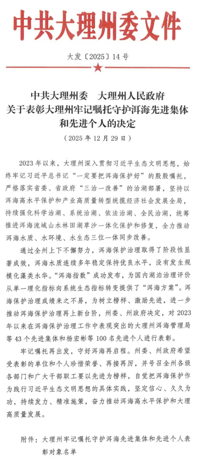 2026-01-12近日,中共大理州委、大理州人民政府印发《关于表彰大理州牢记嘱托守护洱海先进集体和先进个人的决定》,对2023年以来在洱海保护治理工作中表现突出的43个先进集体和100名先进个人予以表彰。集团大理洱海生态环境治理有限公司获评“大理州牢记嘱托守护洱海先进集体”。