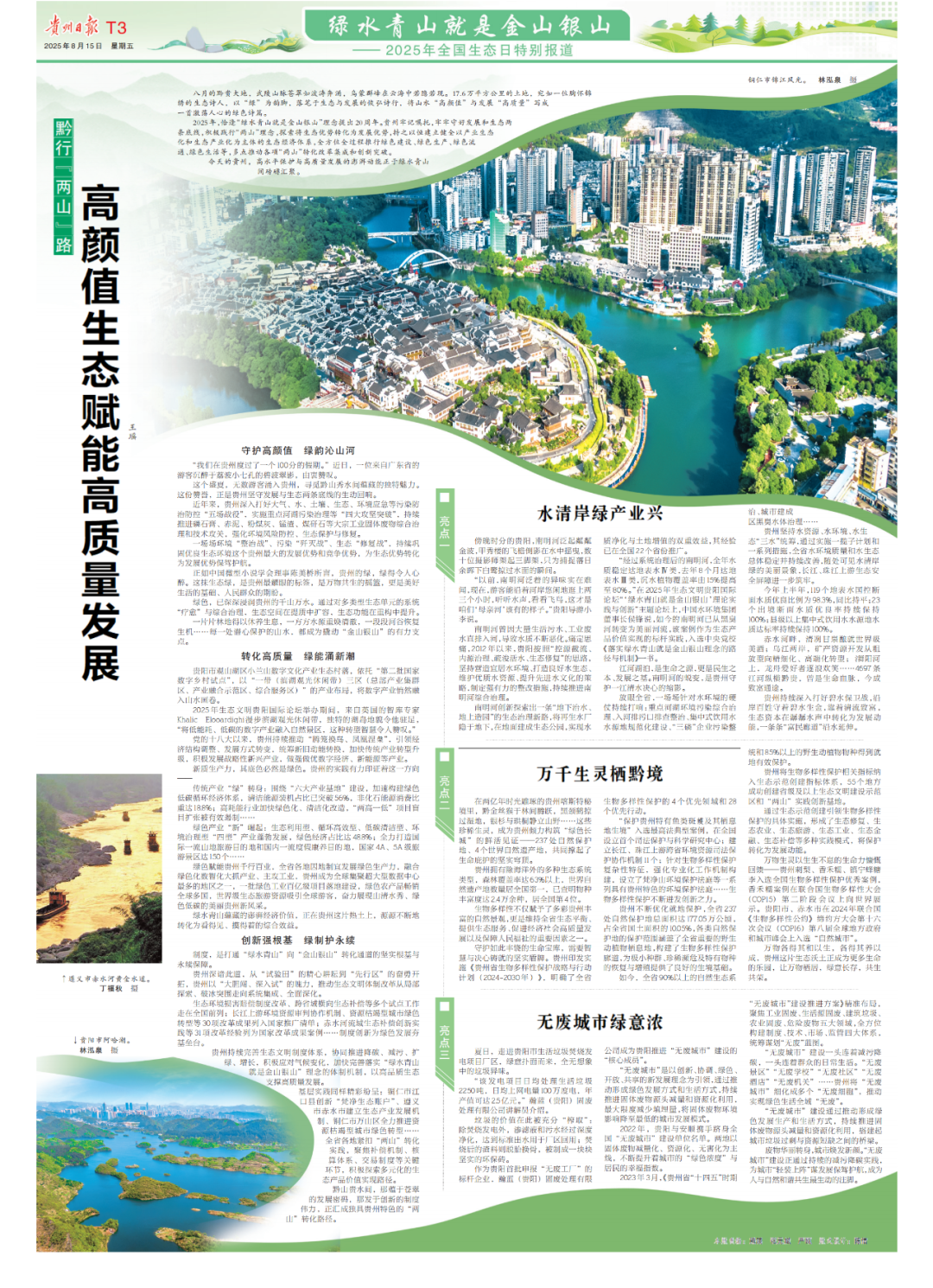 八月的黔贵大地,武陵山脉苍翠如波涛奔涌,乌蒙群峰在云海中若隐若现。17.6万平方公里的土地,宛如一位胸怀锦绣的生态诗人,以“绿”为韵脚,落笔于生态与发展的恢弘诗行,将山水“高颜值”与发展“高质量”写成一首激荡人心的绿色诗篇。