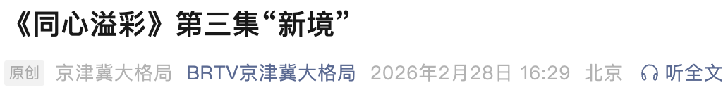 BRTV财经频道2月28日20:30、北京卫视3月1日13:05播出《同心溢彩》第三集“新境”,敬请您收看。