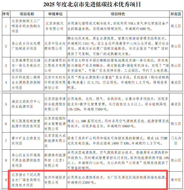 Beijing Municipal Bureau of Ecology and Environment | The Bishui Project has been selected as an excellent low-carbon technology project and typical case for the year 2025 in Beijing